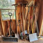 Large Lot Of Yard Garden Tools Shovels , Forks, Rakes, Tamper, Bulb Hole Digger (8 photos)