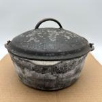 Vintage cast iron Dutch oven with matching lid and bail handle, classic… Read More →