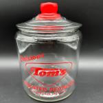 Original Tom’s Toasted Peanuts advertising glass jar featuring bold red graphics… Read More →