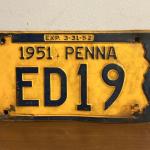 Original 1951 Pennsylvania license plate, yellow with blue letters, state… Read More →