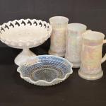 Lot 87K: Vintage Federal Glass Iridescent Beer Steins, Footed Milk Glass Bowl & (12 photos)