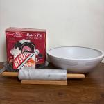 Lot 40: Vintage Bisquick Recipe Tin, Marble Rolling Pin, Large Ceramic Fruit Bowl (23 photos)