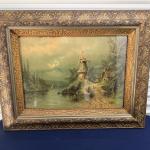 Vintage Romantic Landscape Print – Windmill & River Scene, Ornate Gilt Frame (8 photos)