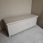 Wooden storage chest on wheels with lift lid. Painted a light gray color. Large… Read More →