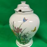 A porcelain vase with lid, adorned with floral and butterfly motifs. Measures… Read More →