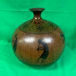 A spherical wooden vase featuring artistic carvings of figures and patterns. The… Read More →