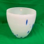 White glass bowl featuring blue accent designs. Approximate height is 6 inches… Read More →