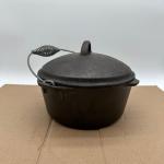 Vintage unmarked cast iron Dutch oven with matching lid and bail handle. Classic… Read More →