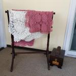 Lot 126P: Wooden Quilt Rack With Assorted Croched Tableware & Vintage Shoe Shine (14 photos)