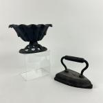 1158 Small Antique Cast Iron Garden Urn Planter And Cast Iron Flat Iron (4 photos)