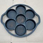 Vintage Lodge cast iron aebleskiver pan with seven round wells, designed for… Read More →