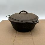 Vintage unmarked cast iron Dutch oven with matching lid and bail handle. Classic… Read More →