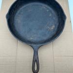 Large vintage cast iron skillet marked “NO. 12 – 13 7/8 IN – MADE IN USA” on… Read More →