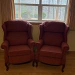This lot includes a pair of two red fabric Queen Ann style wingback reclining… Read More →