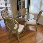 This lot contains a gorgeous glass top dining table with an ornate wooden base… Read More →