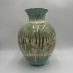 Large studio art pottery vase featuring green, blue, and cream drip glaze… Read More →