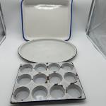 Classic vintage enamelware baking set featuring three pieces: a 12-cup muffin… Read More →