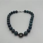 Necklace featuring round blue coral beads with decorative silver tone focal bead… Read More →