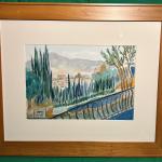 A framed watercolor painting depicting a serene landscape with trees, rolling… Read More →
