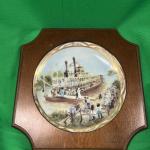 Decorative round ceramic plate mounted on a wooden plaque, featuring a steamboat… Read More →