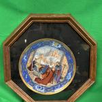 An octagonal wooden frame encasing a decorative plate featuring a detailed scene… Read More →