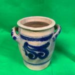 A small stoneware crock with cobalt blue decoration and two side handles. The… Read More →