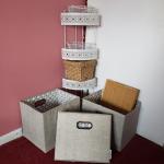 Lot 119Z: White Filigree 4 Tier Metal Corner Shelf With Assortment Of Bins & Bas (10 photos)