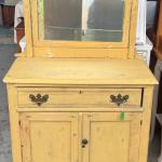 Charming vintage farmhouse washstand with attached mirror and distressed yellow… Read More →