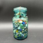 Vintage Ball Ideal Blue Glass Wire Bail Jar W/ Assorted Marbles (7 photos)