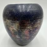 Hand-thrown studio pottery vessel with striking raku-fired finish featuring deep… Read More →