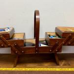 Mcm Wood Accordion Sewing Box Fold Out Top Wood Handle & Sewing Notions Inside (13 photos)