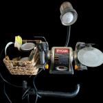 Ryobi bench grinder featuring dual grinding wheels and an adjustable work light… Read More →