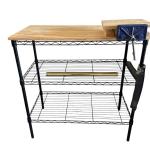 Metal wire utility shelving unit with wooden top surface and attached cast-iron… Read More →