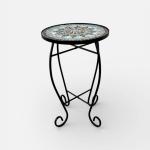 Decorative round mosaic tile top table with a black wrought iron base featuring… Read More →