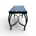 Compact outdoor metal bench with decorative curved legs and woven-style seat… Read More →
