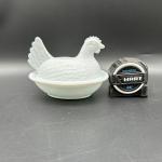 Vintage milk glass hen on nest covered dish, featuring a detailed chicken lid… Read More →