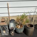 Lot 493: Painted Wood Box With Collection Of Planters, Garden Tools And More (9 photos)
