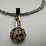 Modern multi-strand wire necklace featuring geometric pendant set with Dalmatian… Read More →