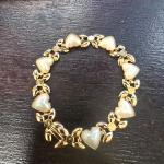 Gold-tone bracelet featuring interlocking heart motifs with pearl-like inlays.… Read More →