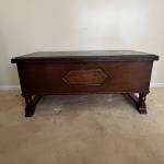 Wooden cedar chest sits atop a four legged base. It has a hinged lid, a two… Read More →