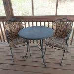Metal patio table with two chairs that appears to be wrought iron. Has removable… Read More →