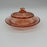 Vintage pink depression glass covered butter dish featuring a detailed floral… Read More →