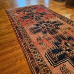 Persian style woven runner rug with red geometric designs and ivory fringe. Rug… Read More →