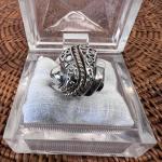 Striking vintage sterling silver ring featuring an ornate openwork filigree dome… Read More →