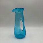 Mid-century style aqua blue art glass pitcher featuring a unique applied handle… Read More →