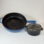 Lot 27K: Cast Iron Enamel Blue Pan & 3 Cup Crock W/ Lid (12 photos)