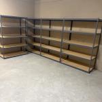 Lot includes five metal framed modular shelving units with particle board… Read More →