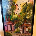 Signed Haitian Folk Art Village Scene Painting Framed Colorful Landscape Wall Ar (4 photos)