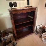 Vintage mahogany-finish open bookcase featuring two interior shelves, a… Read More →