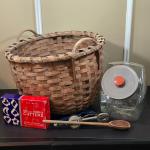 Lot 71D: Vintage Glass Storage Container, Large Basket, Hand Crank Egg Beater & (4 photos)